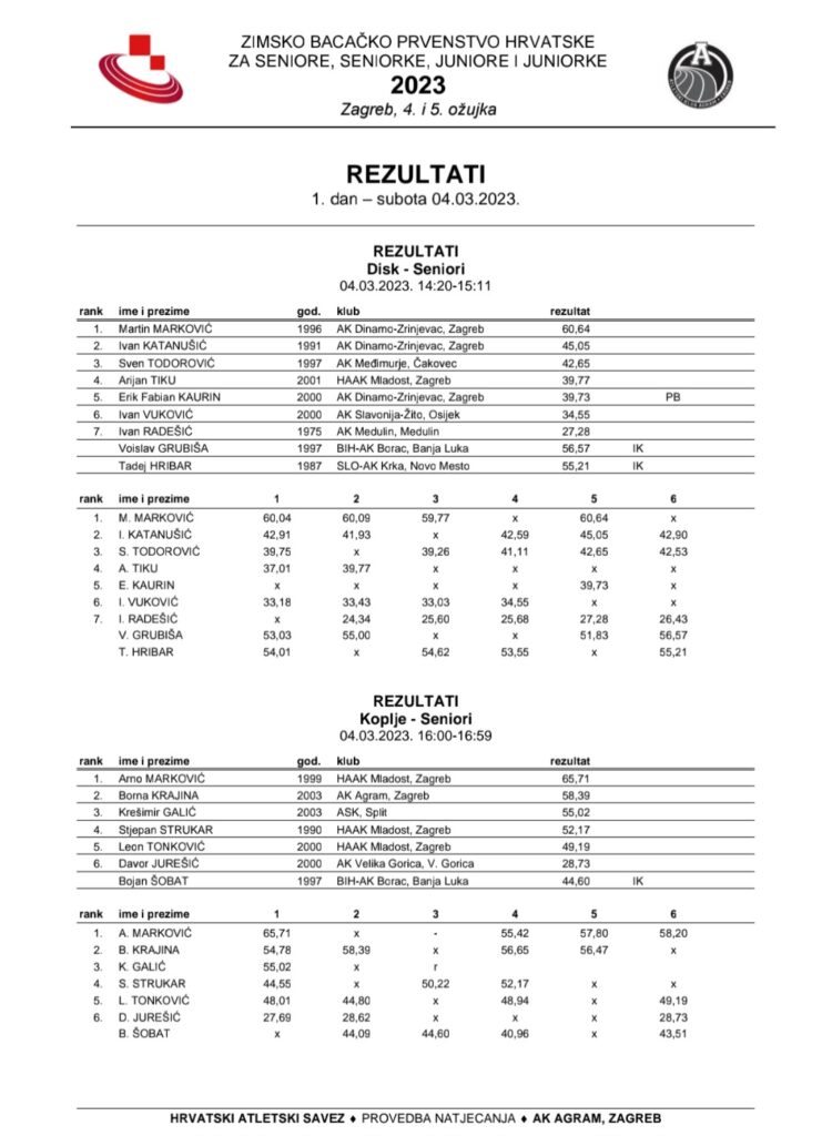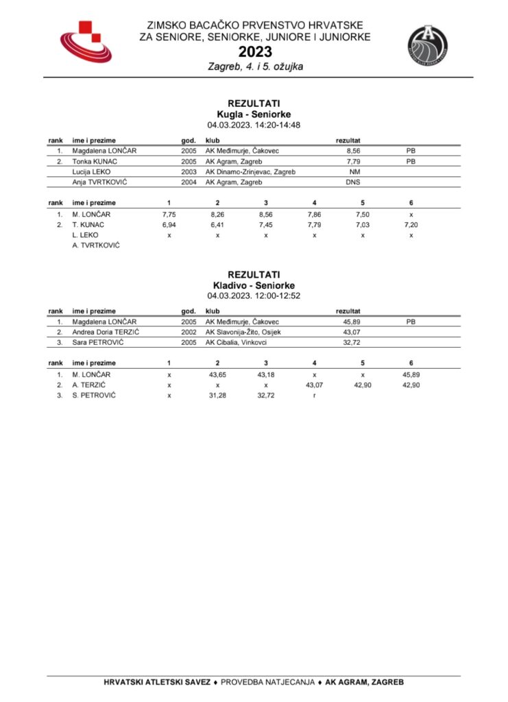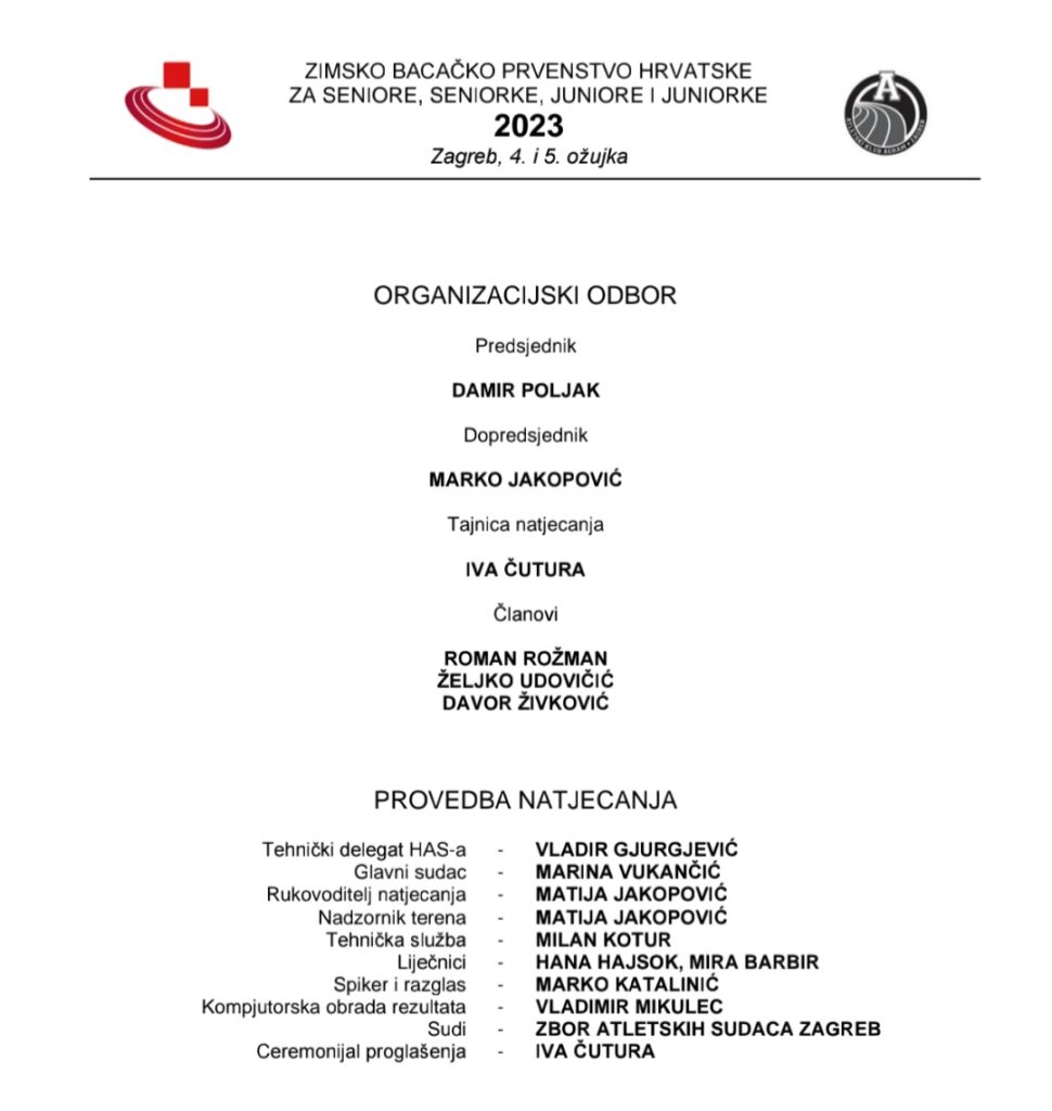 Proteklog su vikenda (4.-5.3.2023. g.) bacači Atletskog kluba “Slavonija-Žito” otputovali na Zimsko bacačko prvenstvo Hrvatske. Umjesto “utabanog” puta u Split, organizacija je ove godine pripala zagrebačkom Agramu, a natjecanje se odnosilo na juniorsku i seniorsku starosnu kategoriju.Odmah prvoga dana, za titulu viceprvakinje države pobrinula se seniorka Andrea Doria Terzić. Srebrnu medalju zaslužila je kladivom prebačenim 43,07m.U istoj je kategoriji i disciplini srebro osvojio i Benjamin Lovrić. Titula doprvaka pripala mu je izbačajem kladiva čak 50,02m.Juniorska predstavnica Iva Perić je, u disciplini bacanje diska, svoj nastup okončala brončanom medaljom i novim osobnim rekordom koji sada iznosi 34,76m.Zanimljivo je istaknuti da su spomenute osvajačice medalja pod palicom trenera Benjamina Lovrića koji vodi natjecateljsku sekciju bacača u AK Slavonija-Žito”, a do odličja ih je doveo praktičnim primjerom – također osvojenom medaljom.