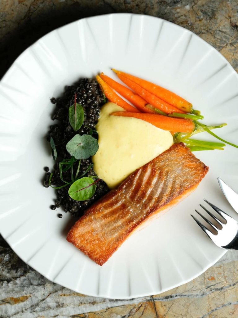 U glavnim jelima naglasak je na balansu elegancije i punine okusa, file lososa dolazi uz crnu leću, mini mrkvu i nježni hollandaise umak, dok file brancina prati krema od celera, zeleni umak od začinskog bilja te proljetna kombinacija graška, boba i tikvica. Posebno se ističe i janjeći but sporo kuhan u crvenom vinu te poslužen uz sotirane mahune, pjenu od gljiva, mladi krumpir i poriluk iz ugljena, koji jelu daje dodatnu dubinu.