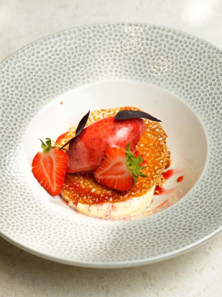 Slatki završetak jednako je dojmljiv, čokoladni brownie bez glutena s kremom od karamele, lješnjakom, domaćim sladoledom od vanilije i čokoladnim krekerom savršeno zaokružuje iskustvo, dok crumble od slanih badema s katalonskom kremom, jagodama u vlastitom soku i sorbetom od jagoda donosi svježinu i laganu proljetnu notu.