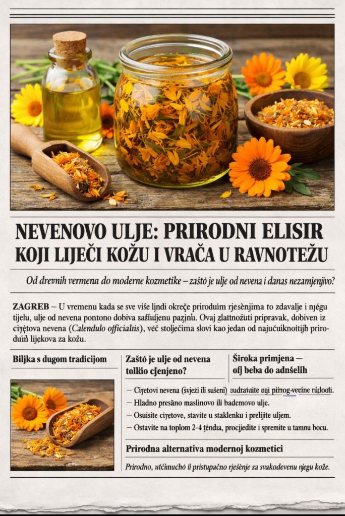 ZAGREB – U vremenu kada se sve više ljudi okreće prirodnim rješenjima za zdravlje i njegu tijela, ulje od nevena ponovno dobiva zasluženu pažnju. Ovaj zlatnožuti pripravak, dobiven iz cvjetova nevena (Calendula officinalis), već stoljećima slovi kao jedan od najučinkovitijih prirodnih lijekova za kožu.
