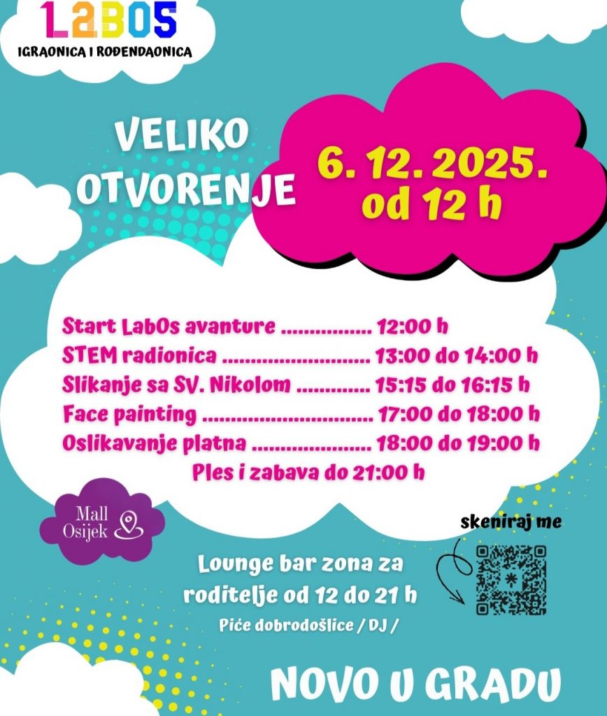 Osijek ovoga vikenda dobiva potpuno novu i jedinstvenu igraonicu – LabOs, moderni STEM centar za djecu koji se otvara u subotu, 6. prosinca u 12 sati, u Mallu Osijek. Riječ je o igraonici i rođendaonici koja spaja kreativnost, znanost i umjetnost u jedinstven koncept učenja kroz igru, a koja već na otvorenju donosi poseban, bogat program uz dolazak Svetog Nikole, nagrade za djecu i kutak za roditelje.
