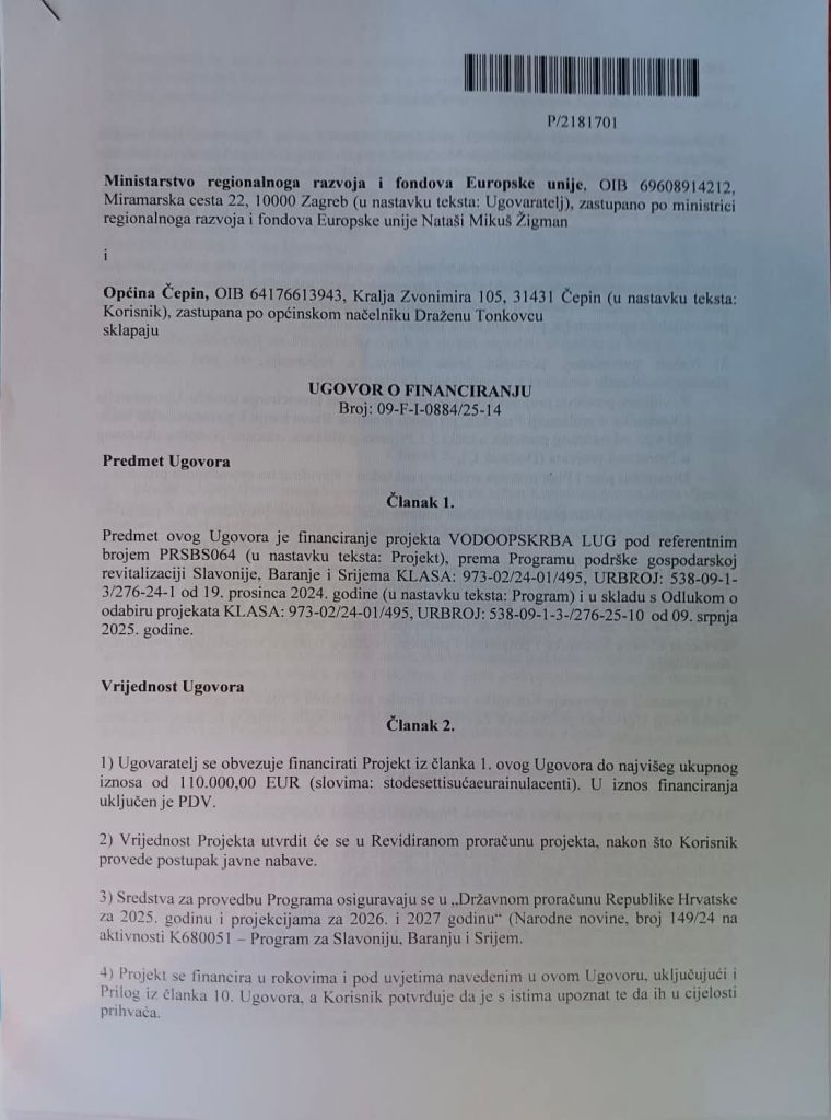 Načelnik Općine Čepin, Dražen Tonkovac, potpisao je danas, 17. srpnja 2025. godine, u Slatini ugovor s Ministarstvom regionalnog razvoja i fondova Europske unije o financiranju projekta VODOOPSKRBA LUG, ukupne vrijednosti 110.000,00 eura.