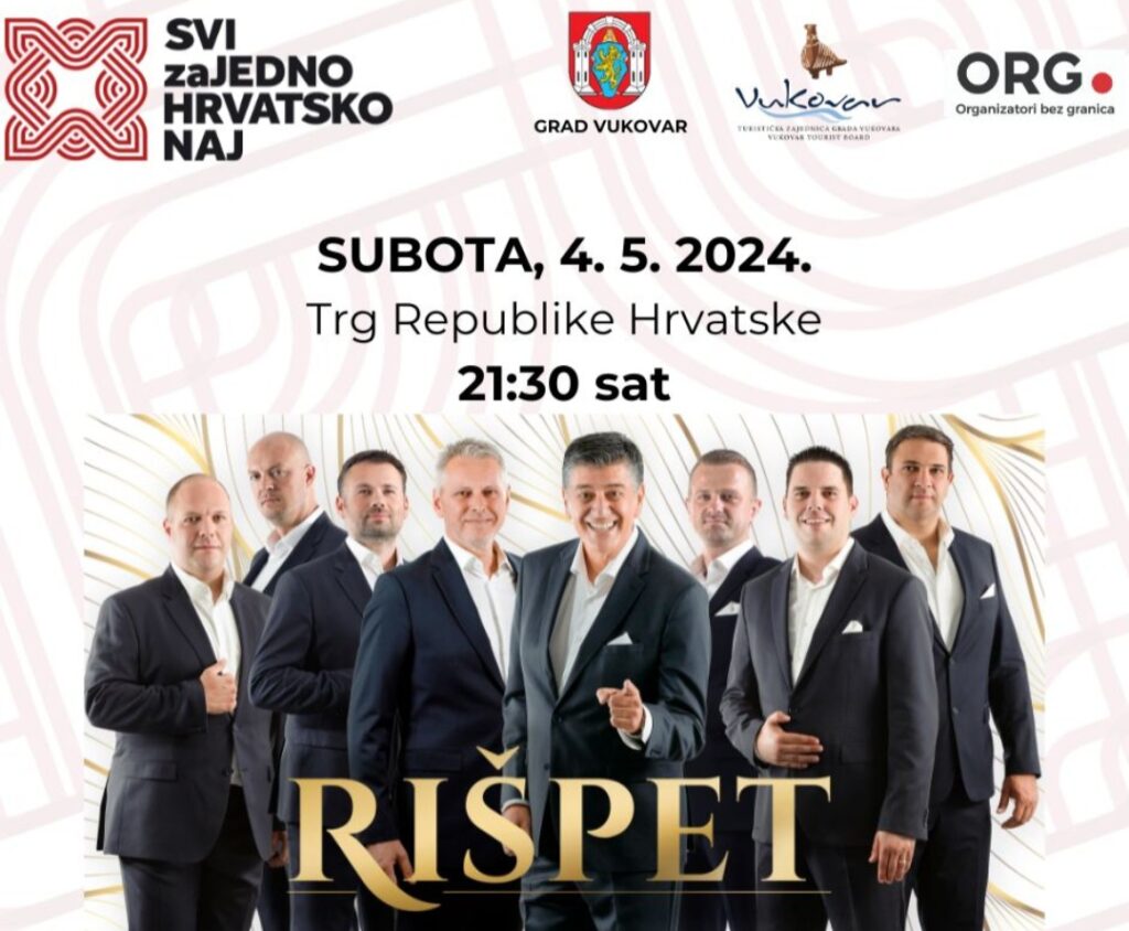 Ovi su „dalmatinski slavuji“, kako ih fanovi često nazivaju, svoju neupitnu kvalitetu potvrdili i snimanjem hit-dueta s legendarnim Mišom Kovačem s kojim je nastao njihov najveći hit „Sunce mi od tebe dolazi”, a snimili su i duete s Jelenom Rozgom “Prsti zapleteni” i s Doris Dragović „Jedina jubav moga života“. Na koncertu u Vukovaru, publika će imati prilike čuti i druge velike hitove klape Rišpet – „Šta mi, ljube, oćeš kazat“, „Ajme šta te volin“, „Maka maka“, „Mislin samo na te“, „Kad je pošla ća”, „Projdi mojon kalon“, „Fališ mi“ i mnoge druge.