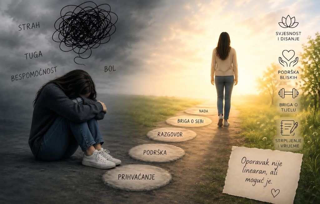• Prihvaćanje vlastitih osjećaja – potiskivanje emocija često produžuje patnju. Dopuštanje sebi da osjetimo tugu, strah ili ljutnju prvi je korak prema oporavku.
